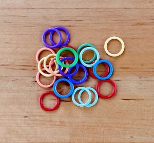 Stitch markers. These are small circles to help mark rows or changes in patterns. Each marker sits between stitches and easily can be slipped from the left needle to the right.