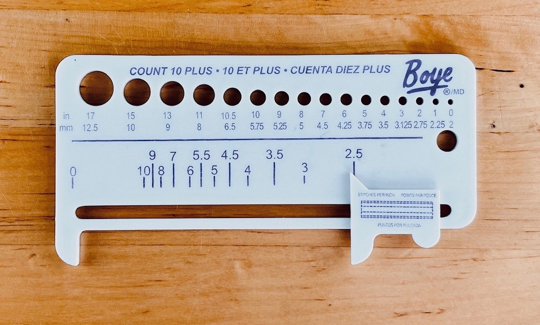 Knitting needle size measurement tool. This is usually a piece of plastic that has holes that match the different sizes of knitting needles, in case your needles don’t have (or you can’t read) the number printed on the side.