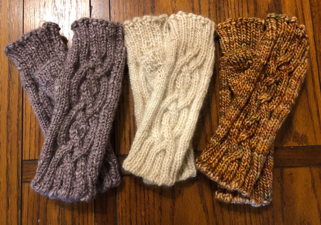 I love, love, love this Vancouver Fog Fingerless Gloves pattern! One Christmas I made a pair of these for all the women in my family. It’s a great pattern for practicing cables as well as the circular tubular cast on for 2×2 rib and Jenny’s stretchy bind off. The pattern includes both short and long versions of the gloves. I like using either the Cascade Yarn (shown in cream and purple below) or Malibrigo (shown in the multi-color gloves below.) The textures are very different but both are beautiful.