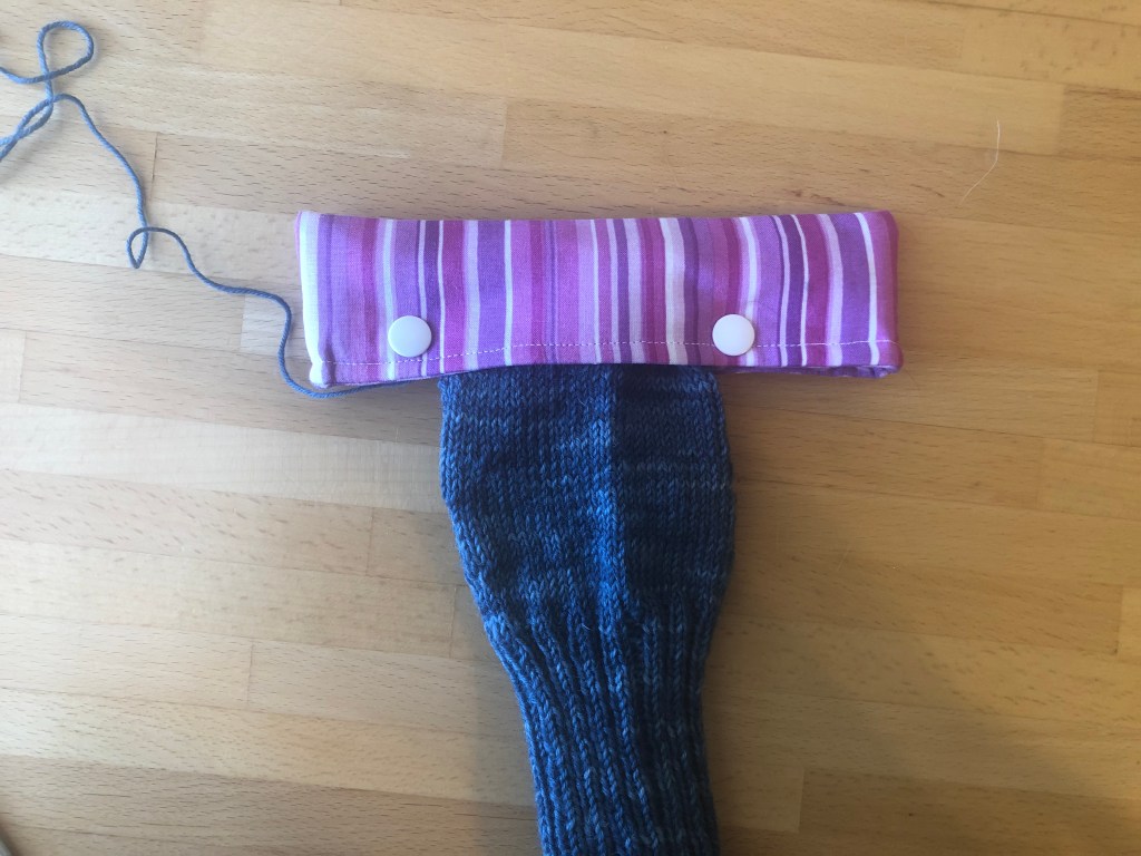 One other tool that’s helpful when knitting a project on DPNS is a case made to hold your project. When you put down your work between knitting sessions, you can gather the needles together and place them in a DPNS case; when snapped closed, the snaps prevent the stitches from moving around and sliding off the ends. You can see an example in the photos below. Another option is to gather up all the needles into a single bunch and put a rubber band around each end of the bundle.