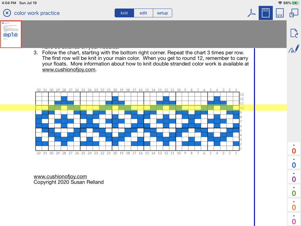 The Knit Companion app is great for colorwork. As shown below, you can use the blue vertical bar to mark where you are in the repeating pattern, and use the yellow horizontal bar to highlight the row you’re knitting. That way you can avoid losing your place. You can download the swatch pattern PDF then import it into your Knit Companion app. I find it’s a little easier to see on a tablet (like an iPad) than a cell phone.