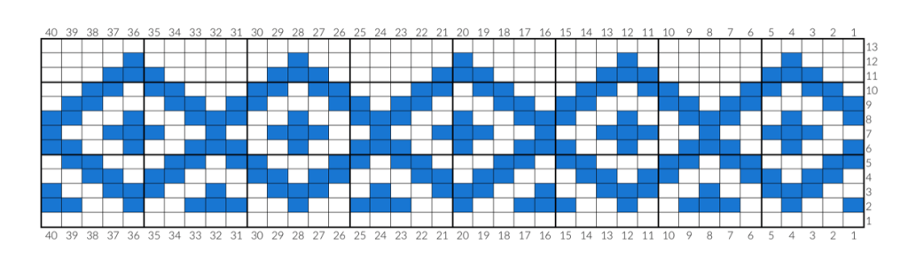 The good news is that means colorwork is almost all knit stitches (not often purl.) To make the design, you simply follow the chart and knit the number of stitches shown for each color. When reading the chart, start at the bottom right corner. In the following example, row 2 is all white; in row 2 you would knit 1 blue stitch, 2 white, 1 blue, 2 white, 3 blue, etc. The video below gives a good demonstration of how to do this.