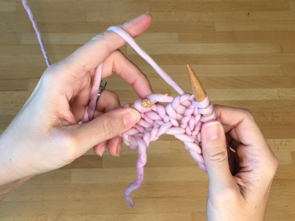 For both M1L and M1R, use your left needle to pick up the bar between the stitches where you want to make the increase. The arrow below is pointing toward the bar.