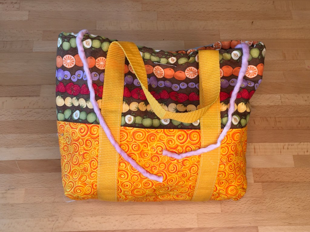 This is the pattern I used to sew my knitting project bags (like the one above.) I have them in various sizes. The one I use to knit socks is about 12” across and 8” tall. The yarn fits in the big pocket and the little pockets around the sides are great for holding things like stitch markers, row counters, small pairs of scissors, a tape measure, and a crochet hook for easily picking up dropped stitches.