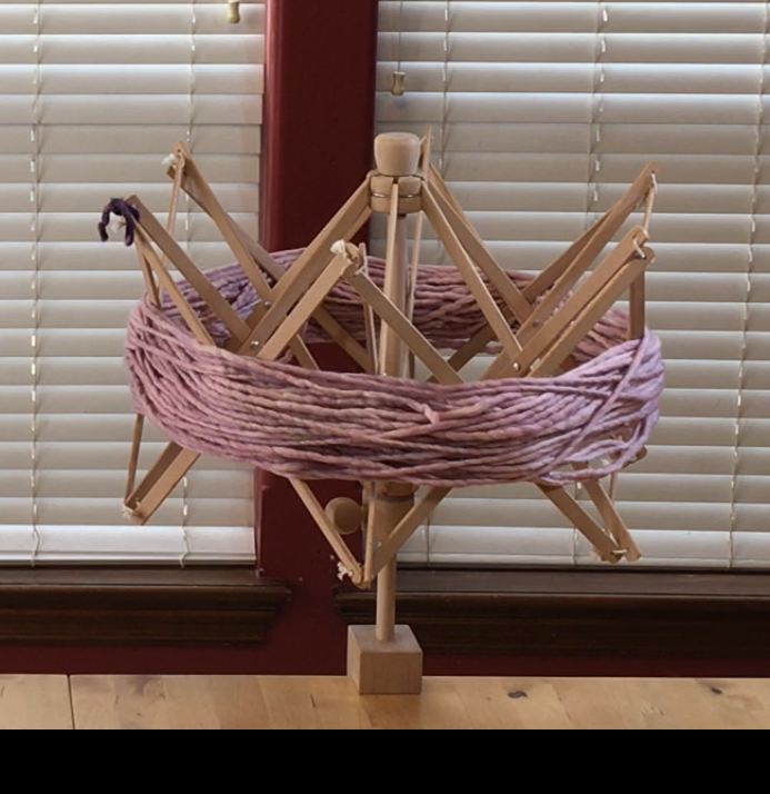 I prefer to wind my cakes with a yarn winder and swift, although I demonstrate several ways of winding yarn in this post. To create two balls of yarn, start by placing the hank of yarn on the swift, then count how many individual pieces of yarn there are. Tie a scrap of yarn on one of the arms of the swift as shown in the photo below. As you begin winding the yarn, count each time the scrap yarn passes by the marked arm so you can count how many strands of yarn have been wrapped into the cake. Stop when half the yarn has been wound, then wind the second cake with the rest of the yarn.