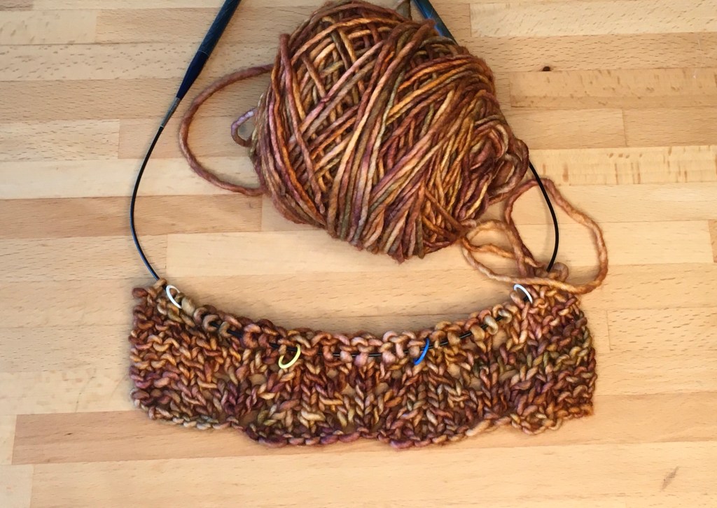 Count on the purl side – If you’re going to have issues with this pattern, it will likely be in forgetting a yarn over. Leaving out a yarn over means when you come back to knit the next row of lace, you’ll be one stitch short. A good way to handle that and keep it from being a big problem is to count the stitches in between the stitch markers when doing the purl row – there should always be 7 stitches in between the stitch markers for the lace section. If you forgot the yarn over and only have 6 stitches, the video linked below that shows how to get started with the lace pattern demonstrates how to pick up a stitch without having to rip back your work.
