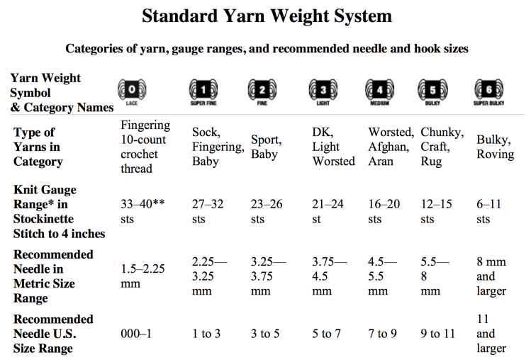 This chart of yarn weight and needle sizes is really handy to figure out which yarns you might be able to substitute in a pattern, which names for sizes are synonyms, and which size needles are likely to be a good fit.