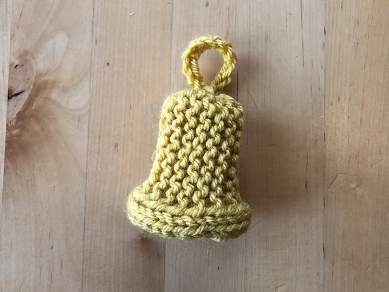 This Christmas Bell pattern is easy to knit even for a very beginning knitter. It’s knit flat and then stitched together. The loop is made with a crochet chain, but could just as easily be made with a loop of yarn or ribbon.